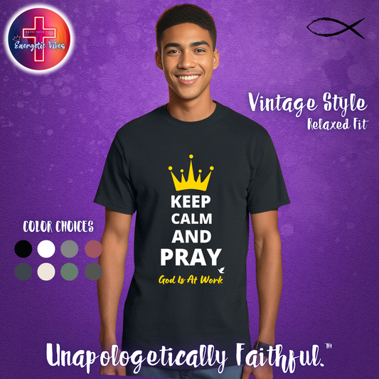 Keep Calm and Pray, God is at Work Unisex Christian T-Shirt | Vintage Style Relaxed Tee