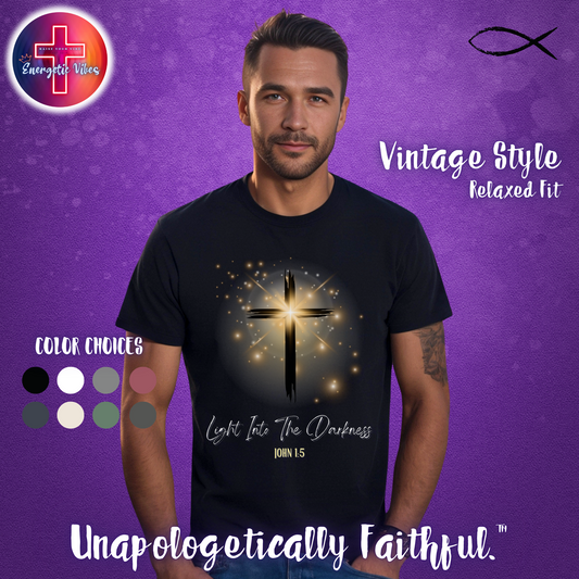 Light Into The Darkness ~ John 1:5 Unisex Christian T-Shirt | Vintage Style Relaxed Tee